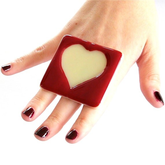 Big Statement Red Love Heart Ring Glass..... are you ready ???MEGA LOVEMake a statement with this beautiful 6.1 centimetre hand made glass cocktail ringHeight 2.1 inch or 5.5 centimetres.With an adjustable band to suit almost any size finger.It is finished in deep ruby red and vanilla glass.You won't be on your own for long with this conversation starter.Look glamorous and be the center of attention always.Handmade with provocative intent:-)I am convo friendly and welcome your comment.Leanne