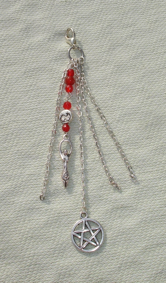 This listing is for a handmade Wiccan/Pagan fashion or bag charm. Has a lobster clasp so you can attach it to sachet bags, purse, jeans, key rings.. about anything! Features silver toned chains, ruby gemstones, Goddess charm, and silver toned pentagram! It dangles about 4".