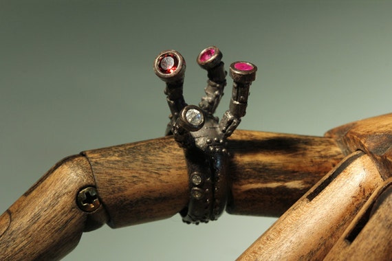 Industrial Tentacle cocktail ring blackened .925 sterling set with rubies, garnet and white sapphire and diamonds