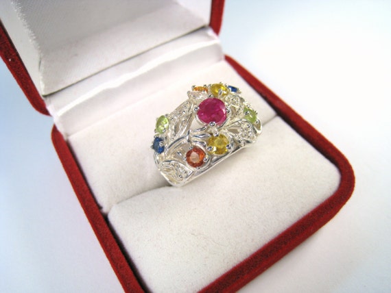 Item: Ladies Ruby, Fancy & White Sapphire RingComposition: White Gold-coated 925 Sterling SilverRuby: 5.0 mm Round Diamond cut at .95 caratColor: Pinkish RedClarity: VS - TranslucentOrigin: AfricaFancy Sapphires: Eight (8) Round Diamond cut pieces measuring 3.50 mm & 2.05 tcwFancy Sapphire Colors: Orange, Yellow, Blue & GreenWhite Sapphires: Seven (7) Round Diamond cut pieces measuring 1.25 mm & .07 tcwTotal Number & Weight of Gemstones: Sixteen (16) at 3.07 caratsRing Face Measurements: 20 mm x 15 mm (approx. .8 inch x .6 inch)Ring Size: 7 - SizableRing Weight: 7.46 grams Condition: ExcellentNote: This is a striking & detailed piece of handcrafted jewelry.Shipping: Free within US & its Territories. $10 fee applies elsewhere.Please see my other jewelry listings. More will be coming in the days & weeks ahead. All are from my private collection acquired via arts festivals, gemstone shows, galleries, custom made & international sources.