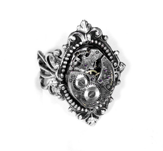 Steampunk Jewelry Ring Vintage Jeweled Watch Ring SOLDERED Renaissance Silver Filigree Adjustable GORGEOUS Steampunk Jewelry by edmdesigns