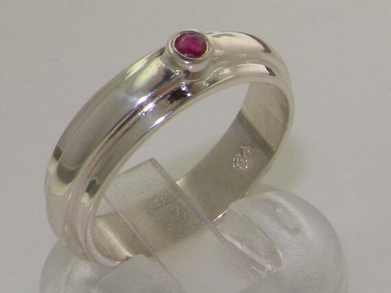 This beautiful ring is part of my new stunning range of contemporary/modern lines and would make a wonderful gift for a loved one or perhaps as a treat for yourself!It will look lovely for any occasion including weddings, engagements, bar/bat mitzvahs, anniversaries, Christenings, Thanksgiving, Christmas, Confirmation, Hannukah, Graduations, Birthdays, Mothers Day. Like all my jewelry pieces, this ring is made in my own workshop. ABOUT THIS RING: The Ruby is a Genuine 2mm round solitaire and is securely set by a rub-over setting that sits above the band. The stone is Natural and therefore unique, and has been carefully selected for color and clarity. The band is approximately 5.2mm wide and the contrast of the Ruby against the Polished White Gold is really eye catching. The total weight of the ring is approximately 4.5g. It is handcrafted in England from Solid9K White Gold, hand-finished to perfection and Hallmarked by the London Assay Office which certifies the rings authenticity. The Hallmark comprises three elements, the 375 stamp, the Leopards Head and the Royal Crown.PLEASE MAKE SURE YOUR TELEPHONE NUMBER FOR DELIVERY COURIER.CUSTOMIZE THIS RINGThis stunning ring can also be made to order in Sterling Silver 9K, 14K, or 18K Yellow, Rose or White Gold*Majority of my designs can be made with most gemstones including Diamond, Amethyst, Aquamarine, Blue Topaz, Citrine, Diamond, Emerald, Garnet, Opal, Peridot, Ruby, Sapphire, Tanzanite, PInk Tourmaline, Turquoise. If I don't have the stones in stock, I can usually get them in specially. Please do email me for a no obligation quote for your favorite stone in this design. If you do wish to go ahead then I will list it on Etsy as a Custom Item.PAYMENT INFORMATIONPayment in full by PAYPAL OR Pay by Layaway - You decide how much you want to pay each week/month, once the full amount has been paid your order will be shipped to you. We require a downpayment of 10% (for stock items) or 50% (for made to order customized items) to secure your purchase.SHIPPING INFORMATIONYour ring will be shipped by Fedex Fully Trackable (USA, Canada, Europe only) or by Royal Mail Registered Mail for other countries.24-48 Hour delivery (exc. Weekends and Public Holidays) (from when the ring ships for USA, Canada & Europe.7-14 Days for other countries (If you require Fedex delivery for other countries please contact me for a quotation with your postal code (Zip code) and Country. Fedex Delivery for other countries will vary from 3 - 5 days (from when the order ships).RETURN INFORMATION If you find you are not happy with what you have purchased and would like to return the item then please do contact us so we can provide you with all the relevant details to make the return easy and hassle free.You can either return the item for a refund or an exchange. We do NOT charge any restocking fees.If you have purchased a ring and it is simply the wrong size then we will be happy to exchange it for the correct size.If the piece of jewelry simply did not suit you then if you can let us know what exactly it was that did not work for you then we will do our best to advise on a suitable ring from our collection that may be more suitable.We offer great service and advice on jewelry purchasing, however, if you would just prefer a refund that is fine too.