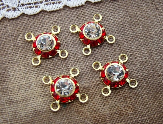 Vintage Swarovski Ruby Red & Clear Crystal Rhinestone Connectors Findings with four rings in brass settings. Lovely rhinestone combination for your holiday jewelry creations and easy to turn into 3 or two ring connectors by snipping off any unwanted rings on the settings. 8mm rhinestone circle with rings these measure 14mm. New old stock, never used.Last photo features other items available in the shop.✿ Quantity – 4 Rhinestone Connectors✿ Color – Ruby Red and Clear Crystal✿ Size – 14mm setting✿ Material – Austrian crystal rhinestones and raw brass settings✿ Other Info – Vintage Swarovski Rhinestone Findings✿✿✿✿✿✿✿✿✿✿✿✿✿✿✿✿✿✿✿✿✿✿✿✿✿✿✿✿✿✿✿✿✿✿✿✿✿✿✿✿✿✿More little treasures: https://www.etsy.com/shop/alyssabethsvintage✿We try to represent the true color of our items, but actual color may vary on different computers or in different light.✿Raw brass items – colors/ darkness can vary from lot to lot and will patina over time.