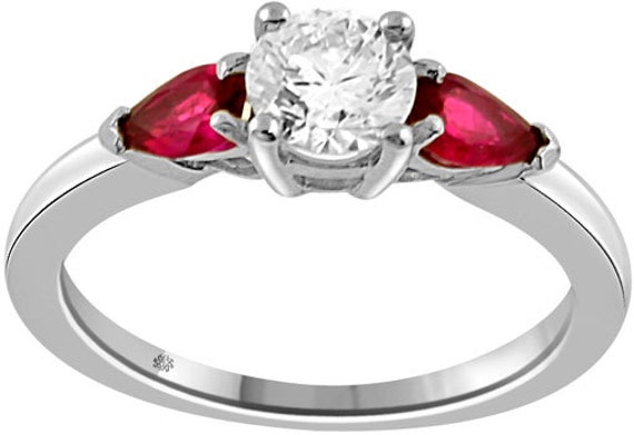 1.00 Carat Round Brilliant Cut Diamond & Pear Cut Tear Shaped Red Ruby Three Stone Style 14Kt White Gold Engagement Wedding Ring