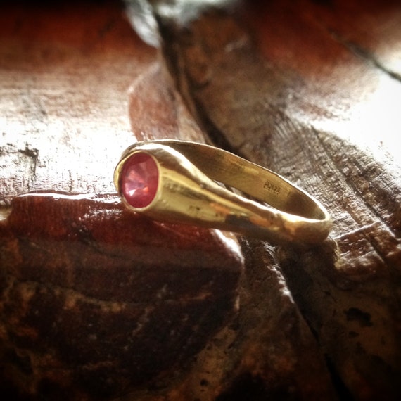 This handmade gold ruby ring is made of solid 14k or 18k yellow gold that is carved and hand-polished to a vintage finish that brings up the lovely colour of the gold.The ring sizes are 3mm to 6.5mm width and 1.3mm thick.This ring is made to order there for please take your order as soon as possible; please specify the required size upon checkout. Smaller or Bigger sizes are available upon request.***All International orders are treated with the same care, consideration, attention to detail and shipping order as domestic. However, Due to the Customs policies and capabilities of each different Nation, Please expect that the delivery of your item can range anywhere from 1 - 4 business days from date of shipment.For many other great personalized items for any occasion, check out my shop here: www.etsy.com/il-en/shop/ADAMAbySharvitThank you,Avi