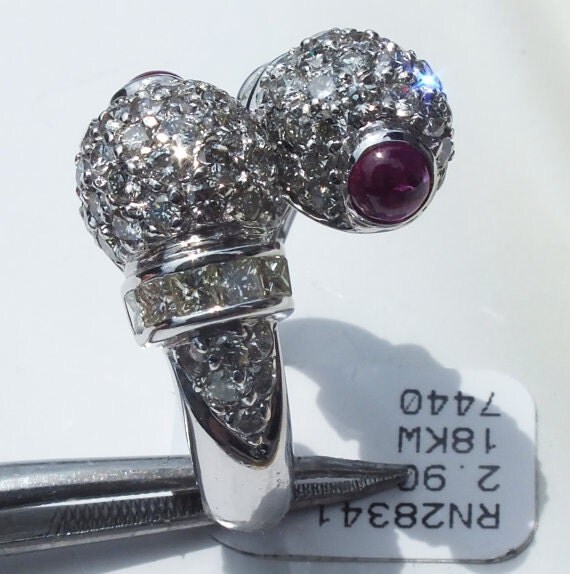 2.90ct Diamonds & .70ct Ruby Wrap Ring 18K White GoldAll Diamonds and Gemstones are natural!Featuring one Ladies stunning Ruby and Diamond Ring. Mounting is 18K solid stamped White Gold. This custom designed wrap ring contains 2.90ct round and princess cut Diamonds H color SI1-SI2 clarity and 2 cabochon round genuine Rubies .70ct total gemstone weight and strong vibrant hues of deep rich red tones.The ring is heavy but very comfortable to wear. Mounting weighs 9.60 grams.Ring size: 8.5The Diamonds are ½ way of the shank.Ring face measures 18mm (North to South) and it rises above the finger for approximately 7 mm.Estimated retail replacement value - $7200.00The ring is stamped “750” for 18K gold hallmark.The item comes in an elegant gift box. The item is guaranteed to be authentic. RETURN POLICY: Buyer must contact within 3 days of receiving your item for PRE-APPROVAL on all returns.TERMS:• All our merchandise is sold “AS-IS” and without warranty, guaranteed to be authentic. • All sales are final with the exception of the return policy if buyer wishes to return item they must do so within the allotted time of 3 business days. • Refunds will be granted once item has been returned in its original condition. Attention International Buyers! *Import duties, taxes, and charges are NOT INCLUDED in the item price or shipping charges. These charges are the buyer’s responsibility.* Please check with your country’s customs office to determine what these additional costs will be prior to bidding / buying. * These charges are normally collected by the delivering freight (shipping) company or when you pick the item up – do not confuse them for additional shipping charges. * We do not mark merchandise values below value or mark items as “gifts” – US and International government regulations prohibit such behavior."ABOUT US: Club Jewelry Mfg, Inc. is committed to excellence!We are in the wholesale jewelry and watch industry and members of Manufacturing Jewelers and Suppliers of America (MJSA). All of our items are 100% fully AUTHENTIC and as represented. Check our feedback and bid with confidence. Our satisfaction comes from making our new and repeat customers happy!SATISFACTION GUARANTEED: Your total satisfaction is our goal. Our items are carefully described and painstakingly photographed to represent each item accurately. We are more than happy to include any additional photographs or information upon request. SHIPPING: (IMPORTANT INFO, PLEASE READ!) All items come beautifully packaged. We ship all our items 2nd day fully insured FedEx. IF YOU HAVE ANY QUESTIONS PLEASE DON'T HESITATE TO EMAIL US or call (847) 541-0700 AND WE WILL BE MORE THAN HAPPY TO ANSWER YOUR QUESTIONS!Stock # RN28341