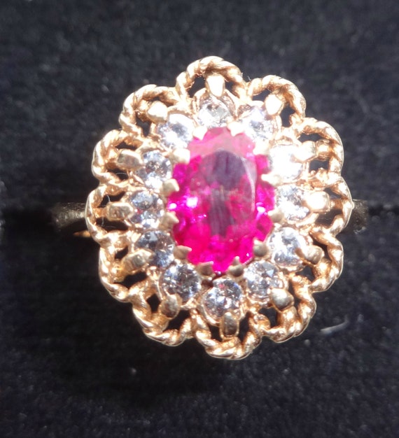 An astonishing cocktail ring that found its way to our hands crossing oceans of time.A beauty from 1947 still sparkling with the brightness of its first youth.This gorgeous cocktail ring in a "rosette" flower design hosts an excellent oval-cut 1.36 ct. Ruby. The stone is untreated/unheated and it would be rated as a VS1. The vibrant red gem was set by hand in the heart of his flower jewel and secured by 12 prongs. Twelve exquisite white Topaz were set around the center stone accenting the crimson heart of the rosette with their flashing reflections. A beautiful lace-work of hand-twisted gold is completing the this splendid cocktail ring. On the inside surface of the band can be seen clearly the hallmarks of "375" which correspond to the 9k quality of the yellow English gold, the town sign of Birmingham where this one-of a kind piece was made and also the letter "x" in the specific font type that was used in the year of its manufacturing. There are also stamped the initials of "D & W" indicative of the jeweler who made it.This ring is a fine example of handcrafted jewelry in the early post-war period. A timeless piece that carried a long history and now it is ready to be passed on to the hands of its next owner that will appreciate it as an collector's item and will cherish it as a precious heirloom."HUGS to ALL and ALL to HUGS!!!"