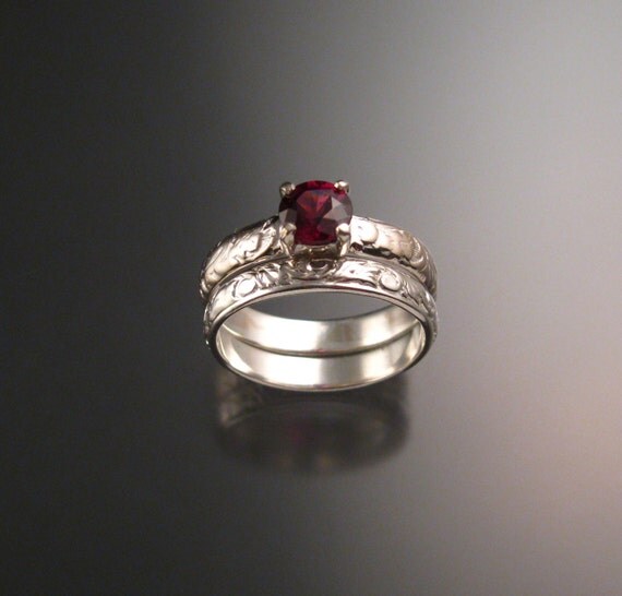 This is a beautiful Raspberry Rhodolite Garnet.The 6 mm stone is eye clean and set in 14k White Gold with 4mm wide shank in a vintage style floral pattern. Garnet rates a 7 on the Mohs scale for hardness.Comes with with matching 3mm band. I can make this ring for you in any size between 4 and 10 1/2. Specify your size at check-out.