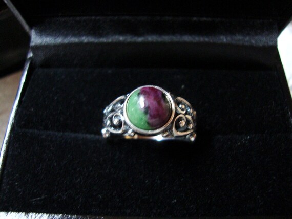The stone is green and red Ruby Zoisite About 8mm diameter, It is set in silver vines. It comes together in the back in a comfortable straight band, the width of which will depend upon the size of the ring. The green is vivid, and the red in this is not as bright as the one with all the light, and not as dark as the ones with no flash or outside light. Every one of these will be different but this is representative of them all.I will make a ring like this for you in your size ! It will take about 3 to 5 weekdays to complete it.All metal is .925 sterling silver from reclaimed/recycled sources. It is eco friendly and guilt free.The stones we use are all ethically mined/made and cut, Fair Trade and guilt free as well. :) A metamorphic rock known as anyolite consists of green zoisite with black tschermakite and ruby crystals.[4][5] These rubies themselves are not of gem quality, but nevertheless their color provides a striking contrast to the green zoisite, and greatly enhances the decorative pieces that are carved from the rock.The mineral was described by Abraham Gottlob Werner in 1805. He named it after the Carniolan naturalist Sigmund Zois, who sent him its specimens from Saualpe in Carinthia.[6] Zois realized that this was an unknown mineral when it was brought to him by a mineral dealer, presumed to be Simon Prešern, in 1797.[7]Sources:www.mindat.org/min-27151.html Mindatwww.cst.cmich.edu/users/dietr1rv/zoisite.htm GemrocksFlint-Rogers, Austin (1937). Introduction to the Study of Minerals. McGraw-Hill Book Company. p. 478.Faninger, Ernest (1988/89). "Neue Daten über die Entdeckung des Zoisits" [New Data About the Discovery of Zoisite]. Geologija: razprave in poročila (in German, with a Slovene abstract) (Državna založba Slovenije [State Publishing House of Slovenia]). 31, 32: 609–615. ISSN 0016-7789.This beautiful rock has nothing in common with Sailor Moon. :)Interesting stuff about Zoisite is found here:http://webmineral.com/data/Zoisite.shtml#.VAYgfvldXKoUse for trust in the universe, releasing fears, to strengthen the heart, energy/adrenals and reproductive Chakra.I have read Ruby in Zoisite is an energy amplification stone that can energize the entire field of one's body. It is used for psychic ability and empowerment.Thank you for looking. Please contact us anytime at all!Do check the Shop Announcement (at the top of the shop page just under the banner) for any SALEs or COUPONs that may be current! :) ** Coupons need to be entered in the coupon box during Etsy checkout.This will come to you gift wrapped. All handmade Apache Moon pieces come with a studio card describing the materials and signed by the artist.We recommend insurance and it is available in our shop section Upgrades. or here:https://www.etsy.com/listing/126252600/shipping-insurance-upgrade100% of the revenue will go to rescue and shelter animals.We have animals everywhere. No smoke.