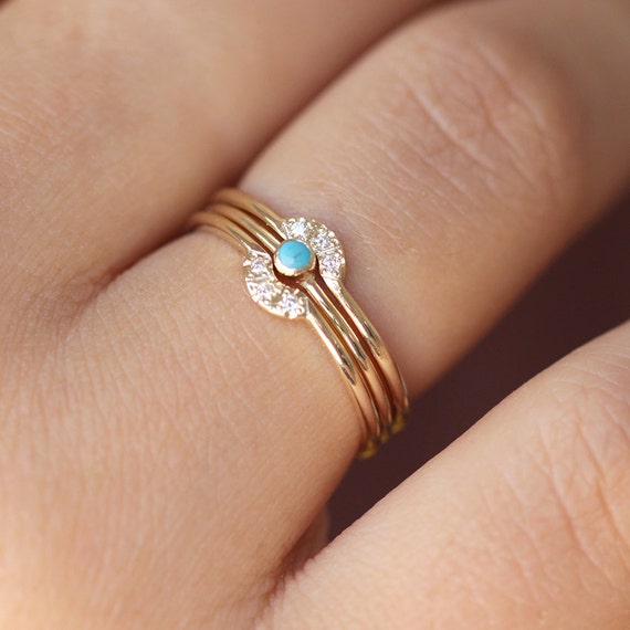 Wedding set (three rings): 2 mm gemstone engagement ring in 14k solid gold and a two matching "diamond crown" rings to fit from each side.Materials: 14k solid yellow gold, 2 mm gemstone, six 1 mm diamonds (conflict free)The available gemstones are: turquoise (turquoise)pearl (white)ruby (deep pink)yellow sapphire (yellow)blue sapphire (blue)emerald (green)black diamond (black)white diamond (white)► This wedding set can be made in YELLOW / WHITE / ROSE gold. The default option is yellow gold, but if you would like a different gold color - simply add us a note with your preferred gold color when you place the order and we will accommodate.You can find these rings separately here:https://www.etsy.com/il-en/listing/184203419https://www.etsy.com/il-en/listing/100624647https://www.etsy.com/il-en/listing/100096228https://www.etsy.com/il-en/listing/99740373--------------------------------------------------------------------------------RING SIZE:This price is for a ring in a size up to 9, if you need a bigger size > contact us for price & details!--------------------------------------------------------------------------------