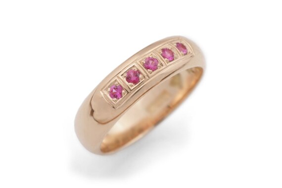 This ruby and yellow gold wedding band is handmade by CaiSanni in Finland.
