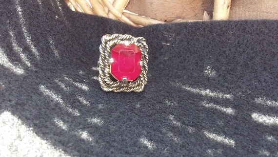 This Sarah Coventry Majorca adjustable ring 5189 has a bright ruby red rhinestone in a rectangle, multi-layered and antiqued golden rope setting.