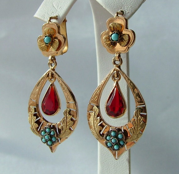 These large and stunning 18k gold earrings are from the 1880's and bear Portuguese hallmarks on the hinged lever back closures and on the the ear wire. The earrings have been tested and are 18k gold with fully articulated pendant style tear drop hoops with bezel set ruby red paste stone suspended and dangling freely in the middle. The turquoise colored stones are glass which was common in Victorian European jewelry and all the stones in these fabulous earrings are original.