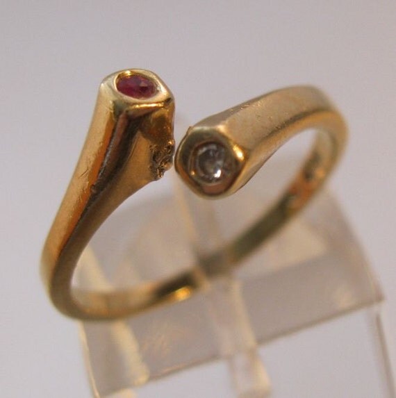 Sweet wrap around 14k solid yellow gold genuine ruby and diamond ring. Not sure if it was soldered together at one time, or this is the way it was originally. But it makes it easier to wear. Ring size 7. Marked 14KP along with a maker's mark of an A within a circle. The P means it is exactly 14k solid gold. The stones measures approximately 5 points each (.05ct). The diamond is SI1 clarity, H-I color. Total weight is 2.5 grams. Lovely piece of vintage fine jewelry.
